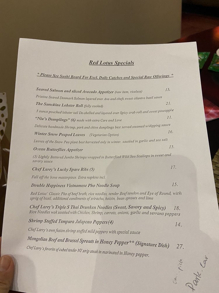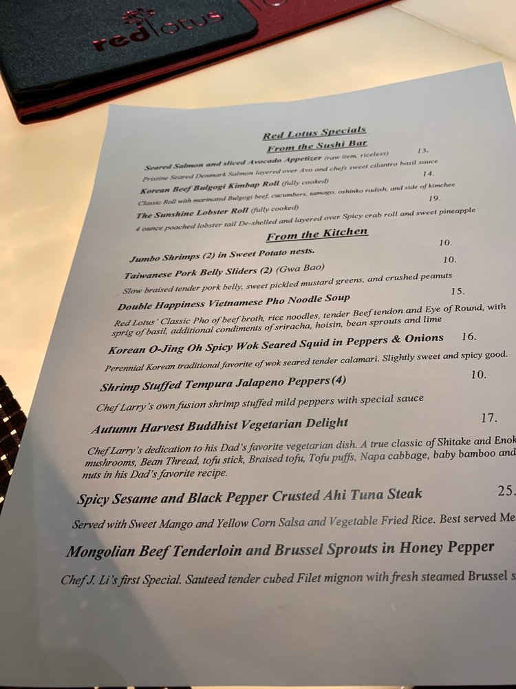Red Lotus in Shelton, CT offers a diverse menu of Asian fusion and sushi bar options. With Vegan and Vegetarian choices, the restaurant caters to a wide range of dietary preferences. The elegant yet casual ambiance, along with friendly waitstaff, ensures a pleasant dining experience. Specializing in fresh sushi and Japanese cuisine, the Seared Pepper Tuna Tataki and Yellowtail Jalapeno Nouveau are standout appetizers. Additionally, the Miso Soup and Velvet Chicken Kani Corn Chowder provide comforting options for soup lovers. Customers praise the flavorful dishes, such as the Shrimp entree, Red Curry Chicken, and Duck sliders. With limited beer choices but excellent service, Red Lotus is a top dining destination in Shelton, praised for its freshness, taste, and welcoming atmosphere.